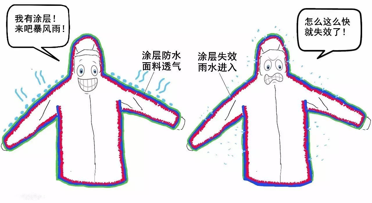 涂層可以實現“荷葉效果”,讓水珠滾落,同時水蒸氣能從面料縫隙排出。