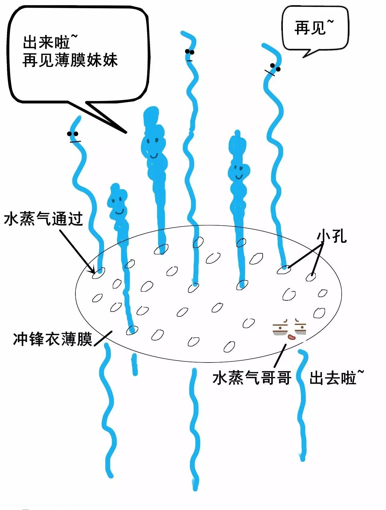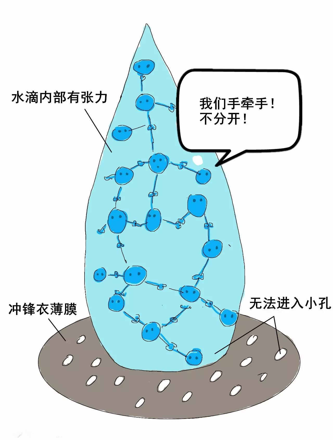 2)沖鋒衣的薄膜的孔很小,比雨滴小很多,所以雨滴進不去小孔。