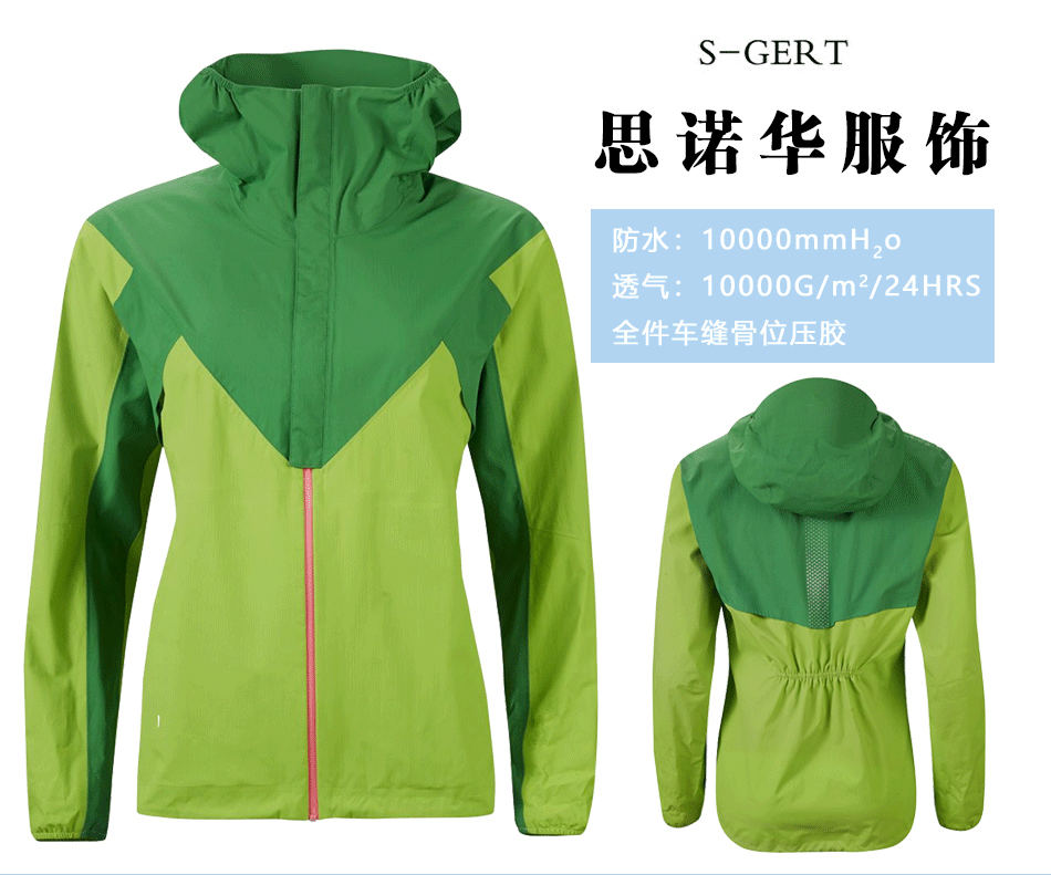 立體版型:后背收腰設計,立體裁剪,防風保暖同時兼備版型,體現女性優美曲線,專業單層壓膠衣定制