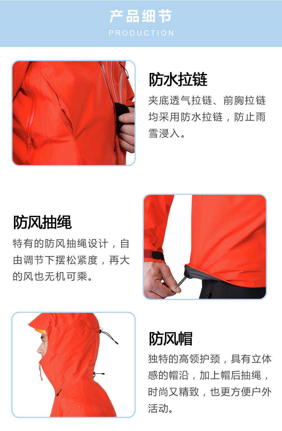 防風帽:獨特的高領護頸,具有立體感的帽沿,加上帽后抽繩,時尚又精致,更方便戶外活動,專業沖鋒衣貼牌代工。