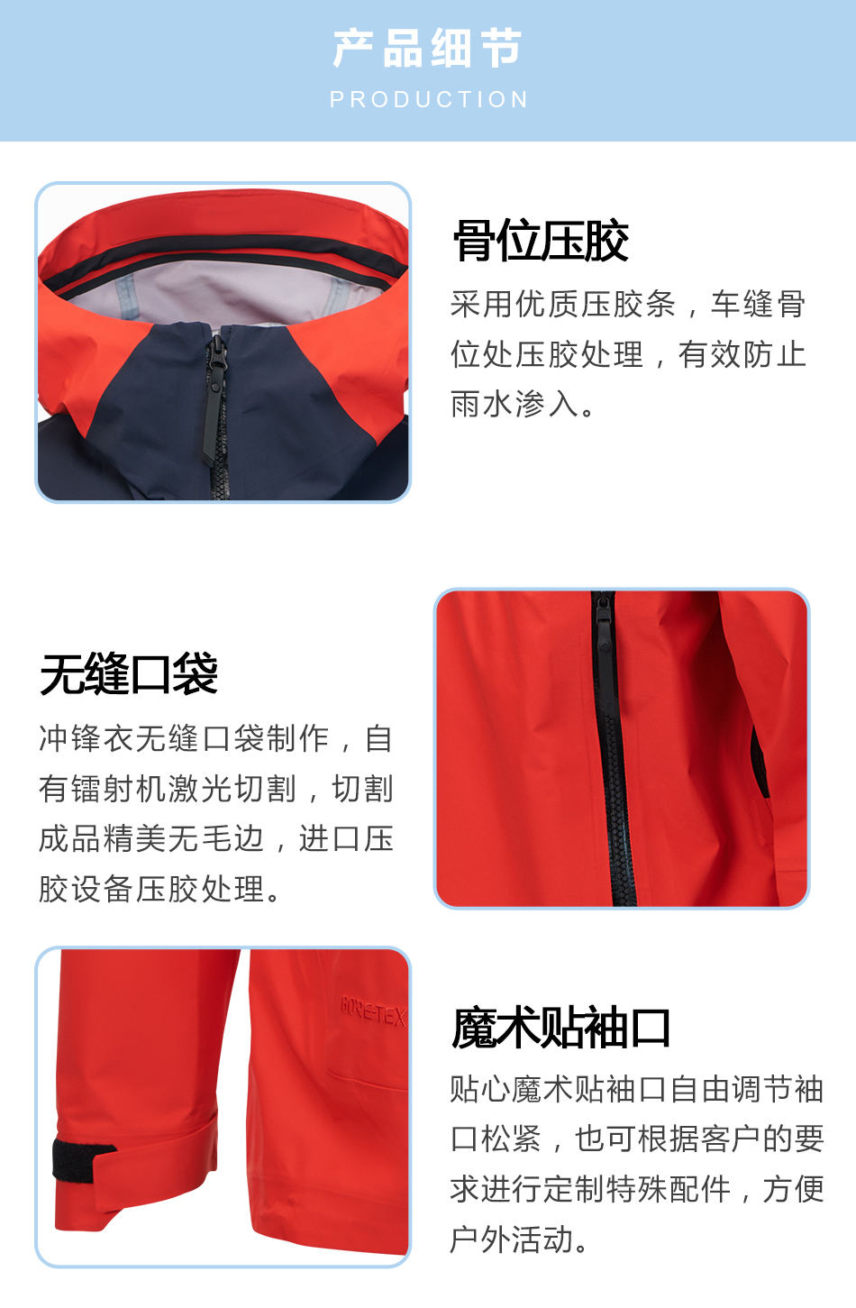 無縫口袋:單層沖鋒衣代工采用無縫口袋制作,自有鐳射機激光切割,切割成品精美無毛邊,進口壓膠設備壓膠處理。