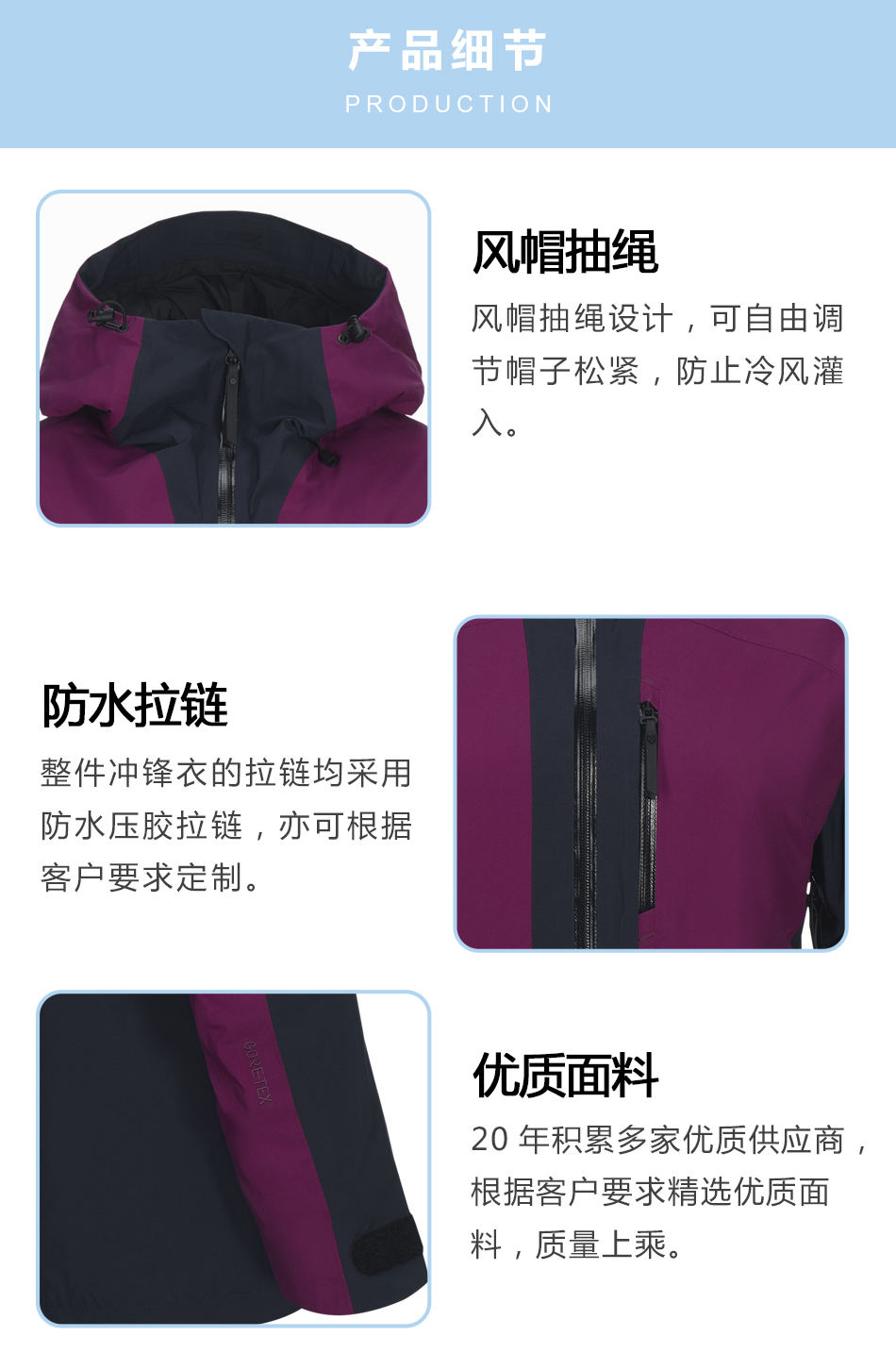 防水拉鏈:整件沖鋒衣的拉鏈均采用防水壓膠拉鏈,亦可根據客戶要求定制。