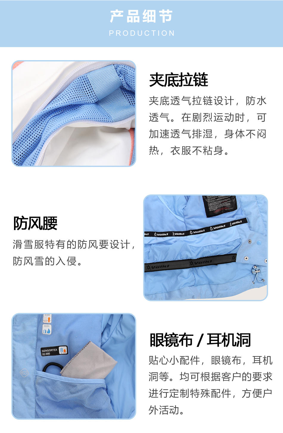 防水拉鏈采用無縫壓膠防水拉鏈激光熱封工藝貼合,面料采用進口防水透氣涂層膜,使防水透氣膜與面料完美結合??筛鶕蛻粜枨笸瓿?/span>戶外沖鋒衣定制。